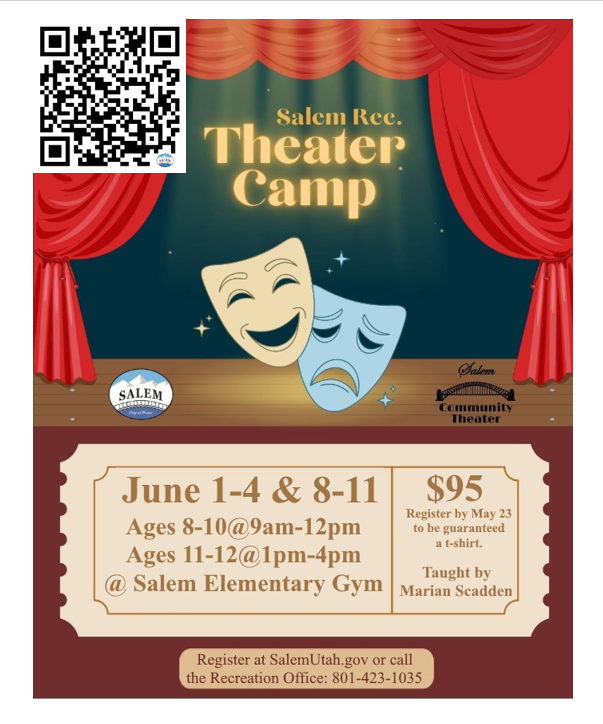 June 1-11, Mon-Thurs, Theater Camp through Salem Community Theater. Registration through Salem Recreation Dept. Young actors will explore a range of theater skills through games, activities and hands-on practice. Students will experiment with styles such as short scripts, improvisation, and basic tech work. The session ends with a showcase of what they've learned.